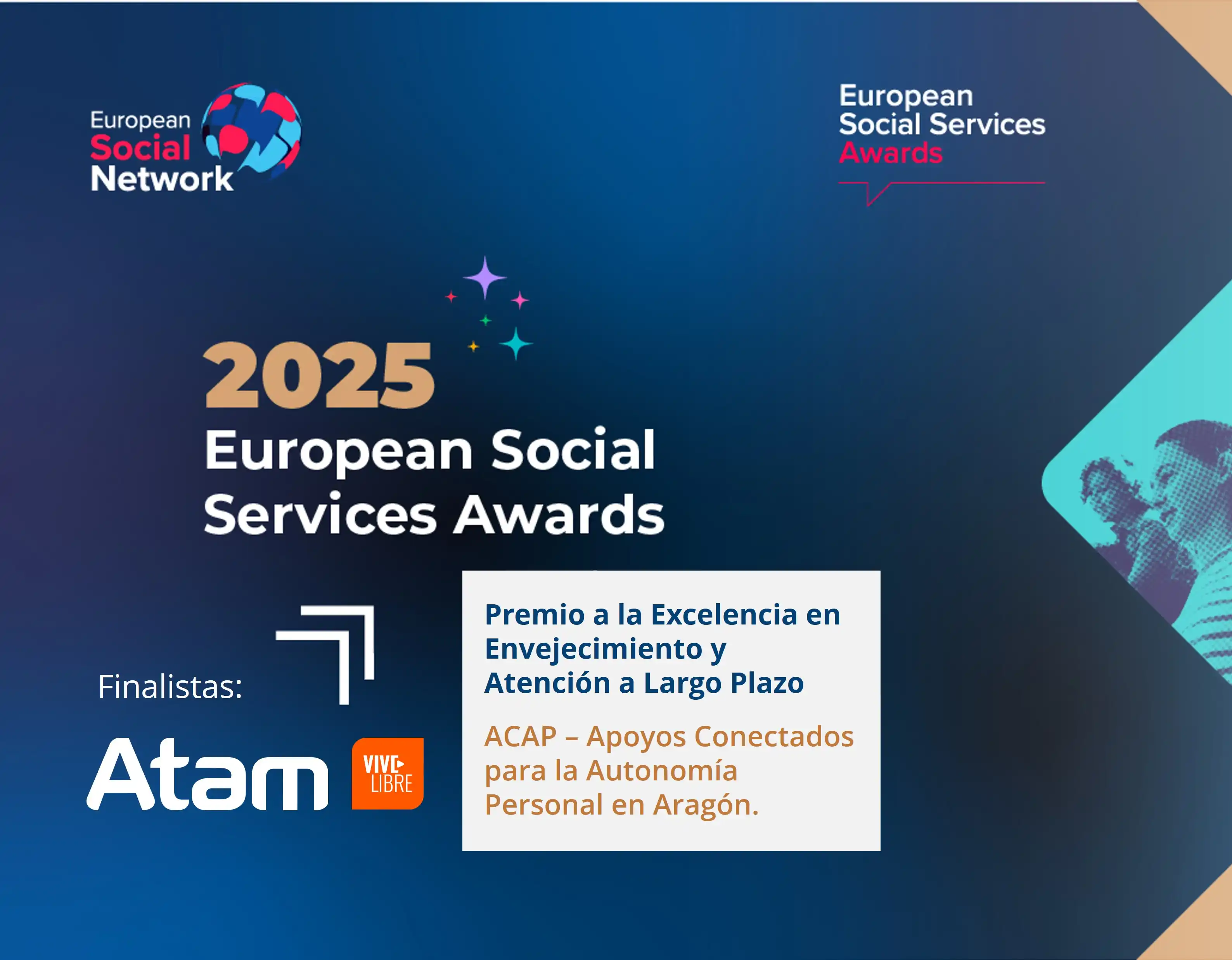 ATAM y ViveLibre han sido seleccionados como finalistas en los Premios Europeos de Servicios Sociales (ESSA) 2025, organizados por la European Social Network (ESN), en la categoría Premio a la excelencia en envejecimiento y atención a largo plazo, gracias a su proyecto ACAP – Apoyos Conectados para la Autonomía Personal en Aragón.